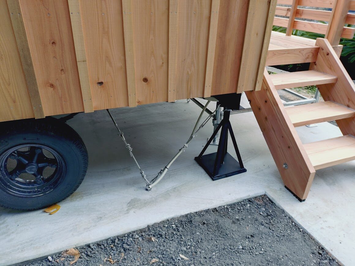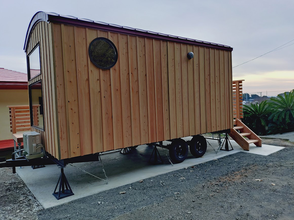 トレーラーハウスとしての国の認定基準は規模の規定と、使用場所に設置後随時かつ任意に移動出来る事が条件とされています、設置後の階段、テラス等のハウスへの固定、あるいはタイヤの取り外し、タイヤのパンク等留意が必要です。
